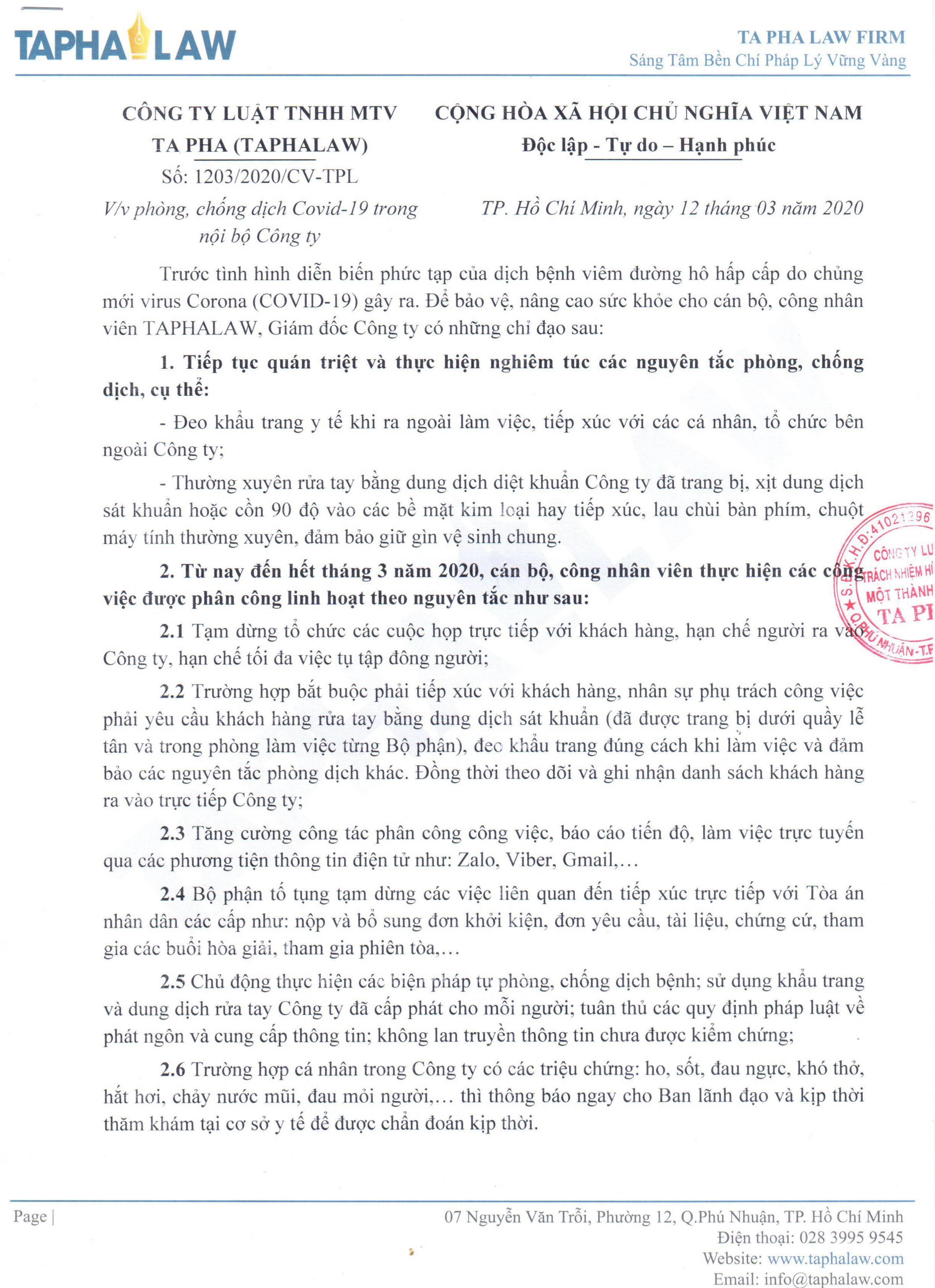 Ngày 12 tháng 3 năm 2020 Giám đốc Công ty TAPHALAW phát hành văn bản 1203/2020/CV-TPL: V/v phòng, chống dịch Covid-19 trong nội bộ Công ty.